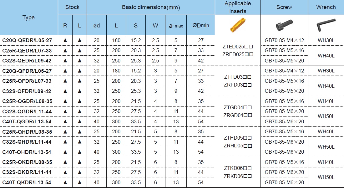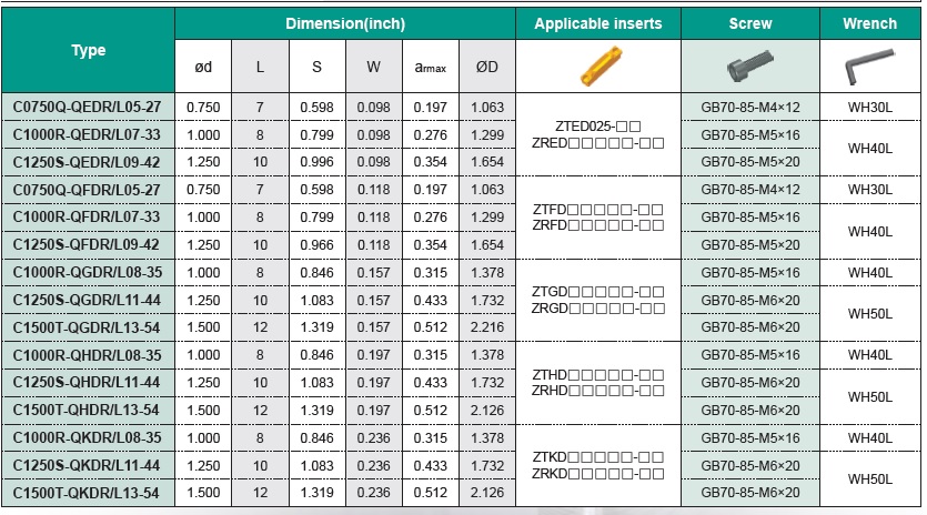 | 0.75" (20mm) diameter, 7" (180mm) long, ar(max)=0.197"(5mm), minimum machining diameter=1.063"(27mm), with double cutting-edge internal grooving and turning tools $55.50 |