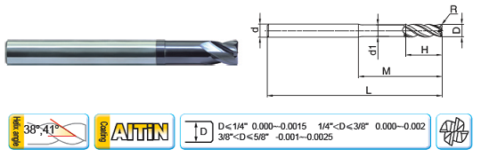 Feature: 4-flute long neck and short cutting edge unequal pitch R end mill with straight shank, 38, 41 degree helix Material Grade: KMG405 Coating: AlTiN Application: Unequal pitch and variable inclined angle design very suitable for machining of hard-to-cut materials such as stainless steels, Ni-based high temperature alloys, etc.