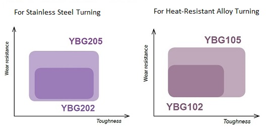This TiAlN multilayer nano coating grade with ultrafine-grained carbide offers high wear and high-temperature oxidation resistance, and higher toughness than YBG102. Inserts in this grade with NF and NM chipbreakers are excellent choices for finishing to semi-finishing of heat-resistant alloys, respectively.YBG202 (ISO Class: P10-P30, M10-M25, S10-S20)